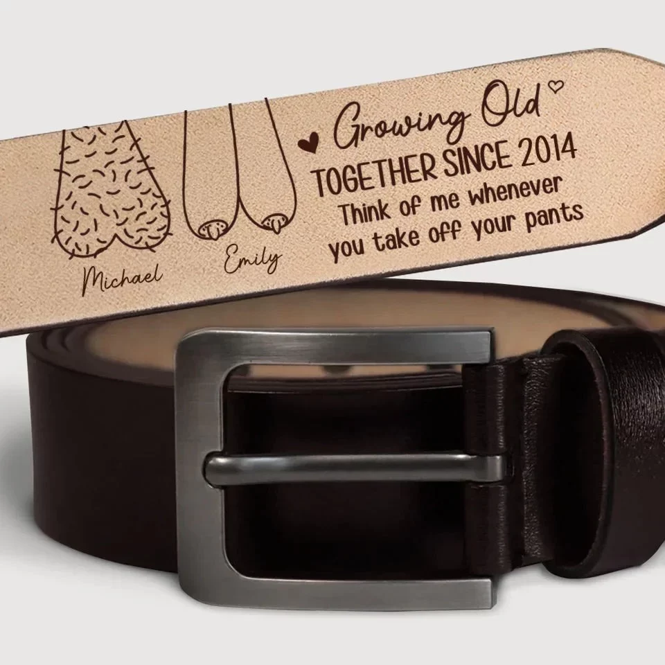 Aging with Love and Laughter – Customizable Couple’s Leather Belt with Engraving – Perfect Anniversary Gift for Husband or Boyfriend